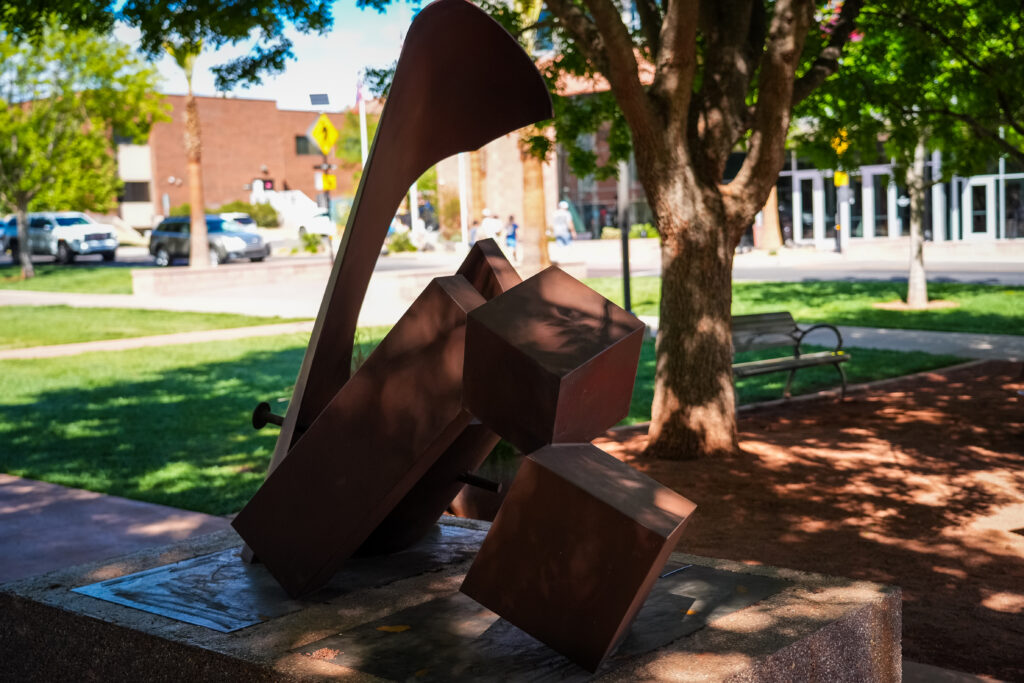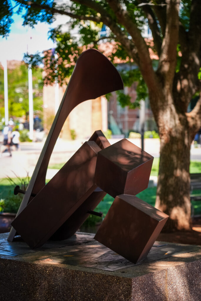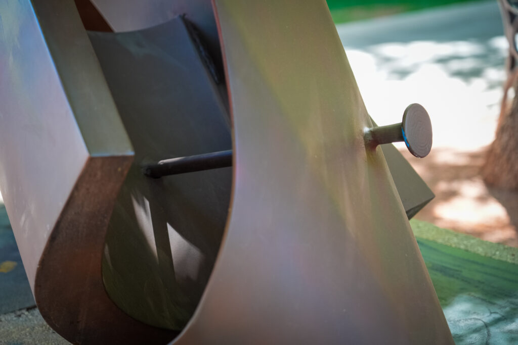 Geometric elements shift between stability and motion, where solid shapes feel unexpectedly light and playful. The sculpture invites a physical response, asking viewers to sense the push and pull between structure and fluidity.