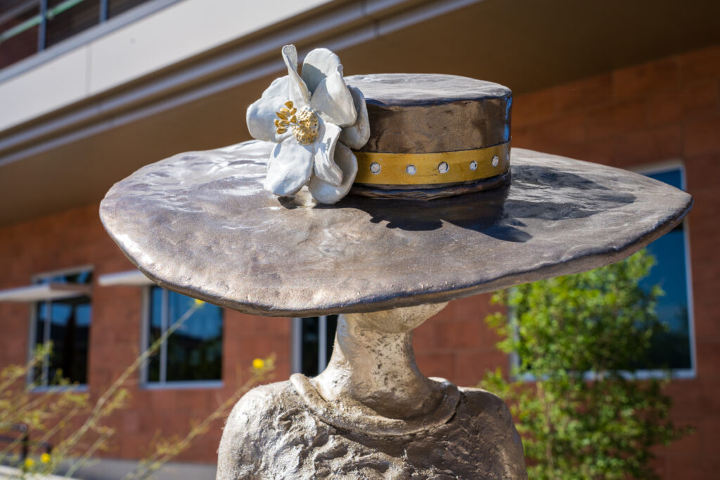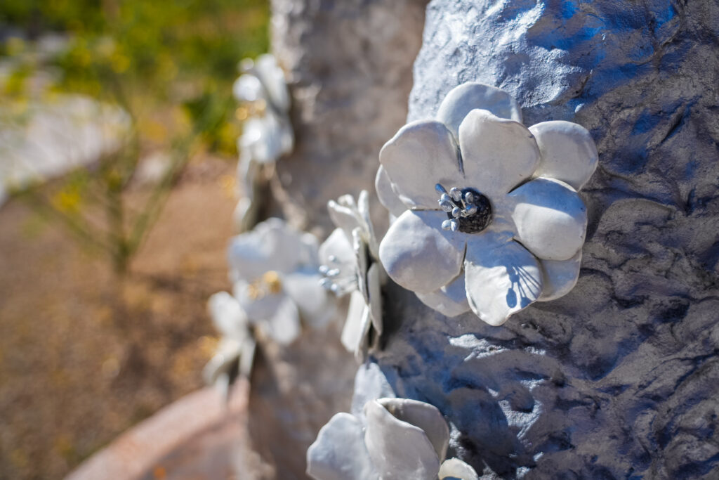 Material plays an important role in her work. This piece is created using Pal Tiya, a fiber-infused cement material that begins with a clay-like softness and cures into a durable, stone-like finish. Additional details, including the floral elements, are sculpted with epoxy clay, enhancing both texture and longevity for outdoor display.