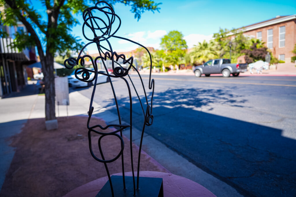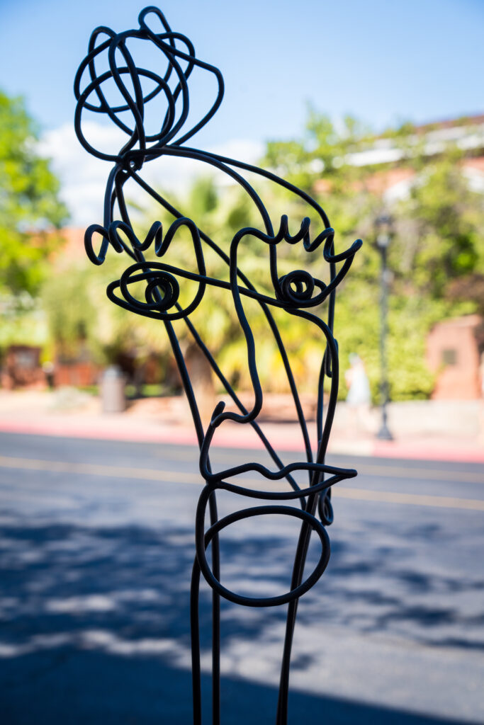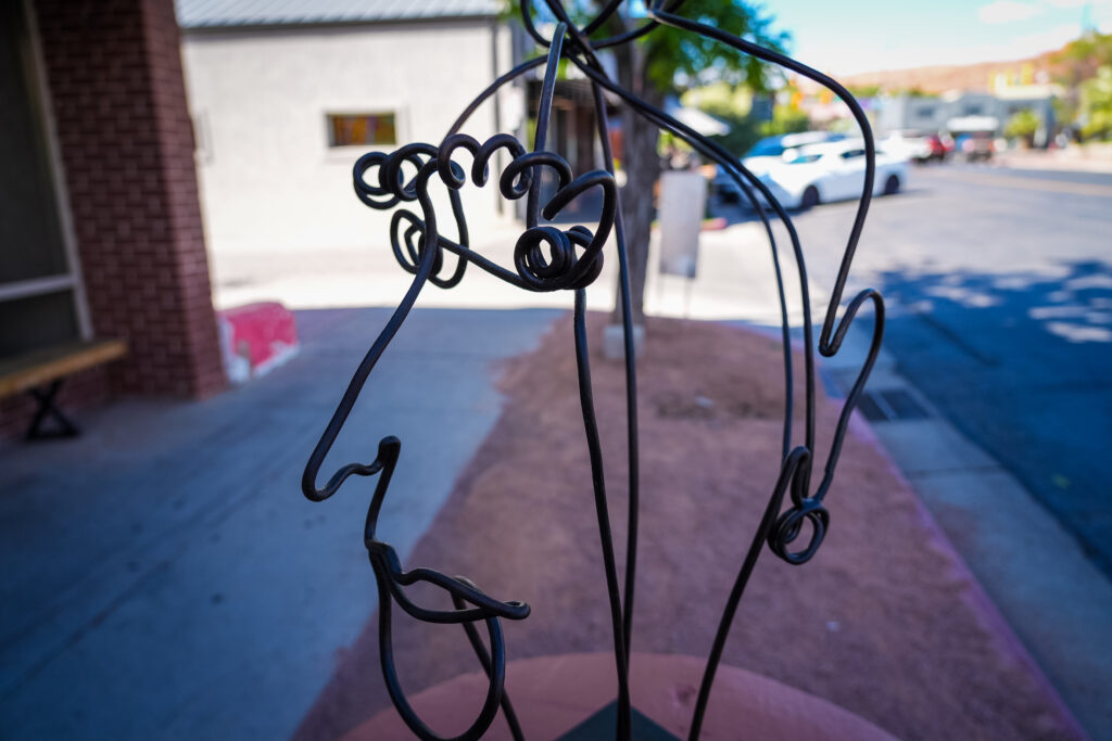 This piece is a portrait representing Utah’s strong women of the past. During the recent anniversaries of the suffrage laws here in Utah, I was inspired as I learned about the amazing women from this area. This was clearly not an easy place to settle; everything had to be earned. Survival required a strong sense of self-reliance, commitment, and creativity. I think those traits continue today, and I hope to foster them through this piece. The model for my piece is a conglomerate of women that I have seen in both historical photographs and my own observational sketching. It is constructed entirely from steel, in different wire gauges. It has a strong presence and conveys a feeling of confidence while being friendly and engaging.