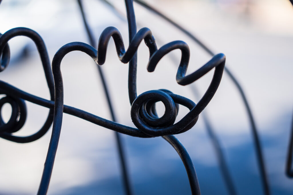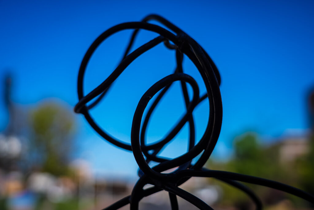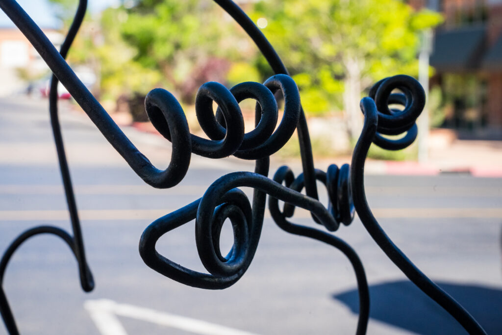 I call this piece “Timothy,” and it is inspired by the quail that are often found scurrying through our neighborhood. I think they are beautiful little creatures and interesting to watch as they bob through my yard. I always like to name sculptures, as I am trying to imbue them with personality and feeling. With all of my sculptures, I try to create pieces that are both approachable and engaging, simple but with complexity. I feel as though I am successful if people are drawn into my work and smile. This sculpture is made from steel, in various wire gauges.