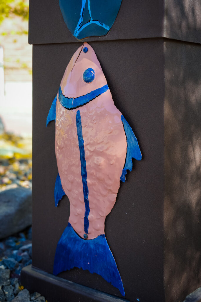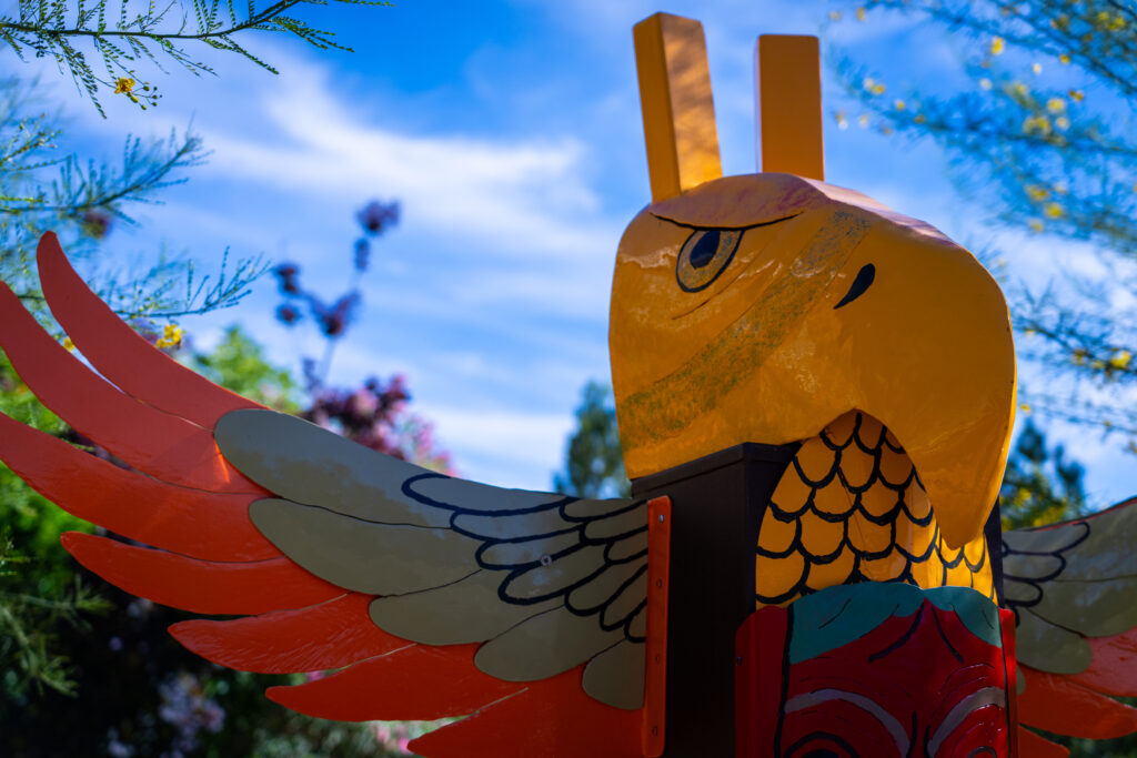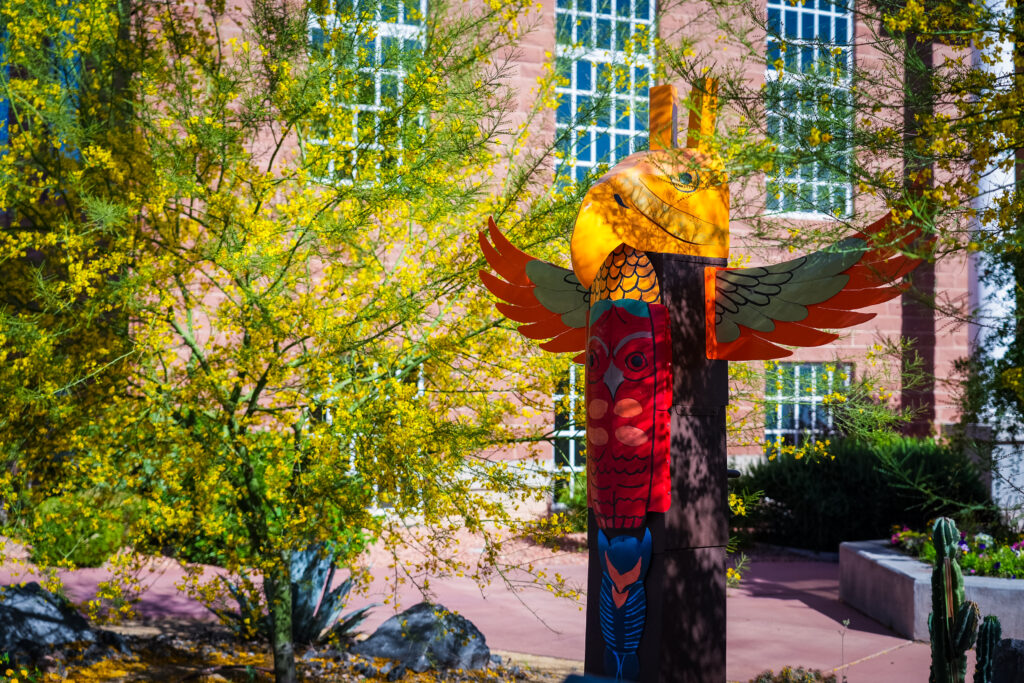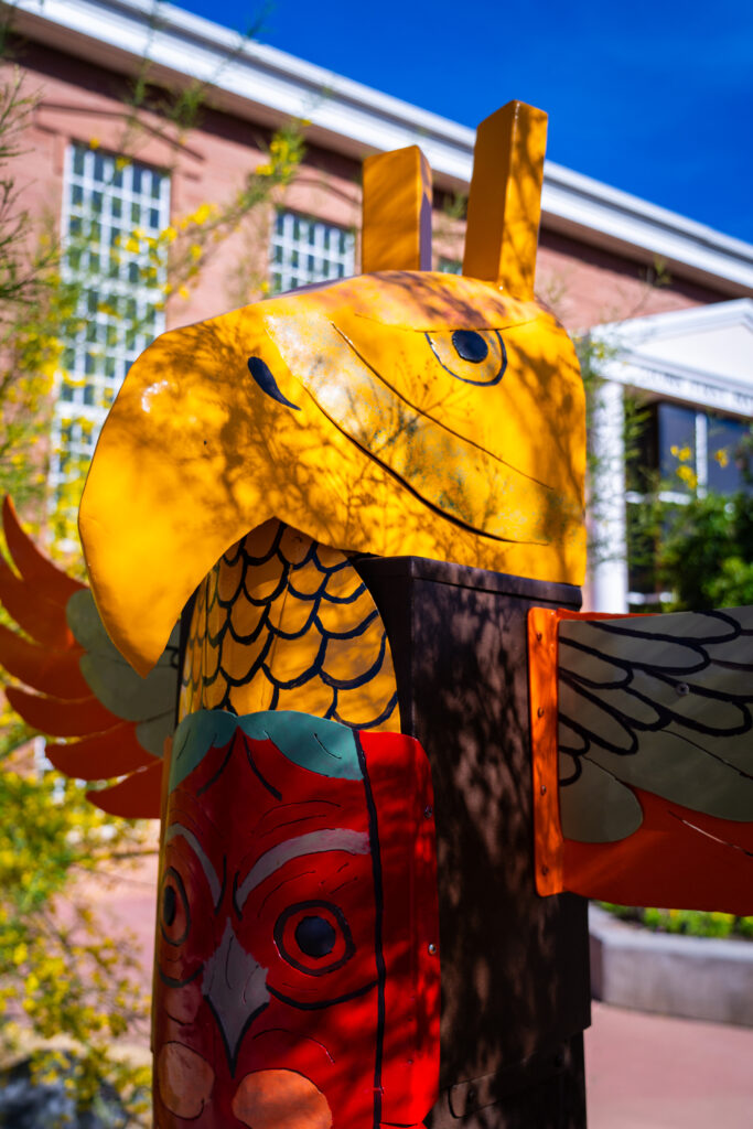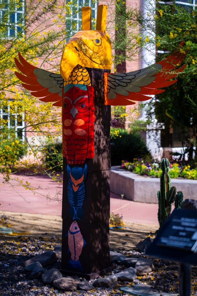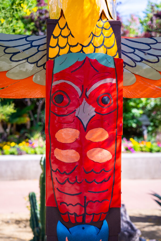 Rising in stacked metal forms, the sculpture reflects themes of heritage, identity, and connection to place. Inspired by travels through Washington, Oregon, Canada, and Alaska, the work honors the visual language of totem poles and the cultural stories they were created to preserve.